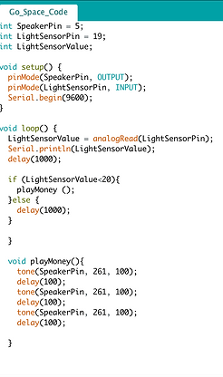 The first code we created was for the GO space. This code would read a light sensor, and if the light sensor was blocked would make a sound to indicate that one should collect the $200 that comes with passing GO.This code began by initializing the necessary pins, then setting the light sensor as an input and the speaker as an output. We were then able to create an if statement which would read the value of the light sensor every 1000 milliseconds, and do one of two things depending on the reading. If the value was above 20, the sensor would simply delay an additional 1000 milliseconds before trying again. However, if the value was below 20 the speaker would sound tone 261 for 100 milliseconds three times.